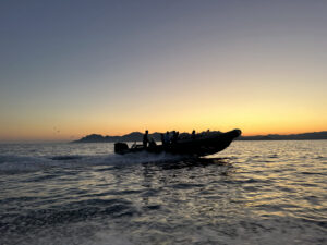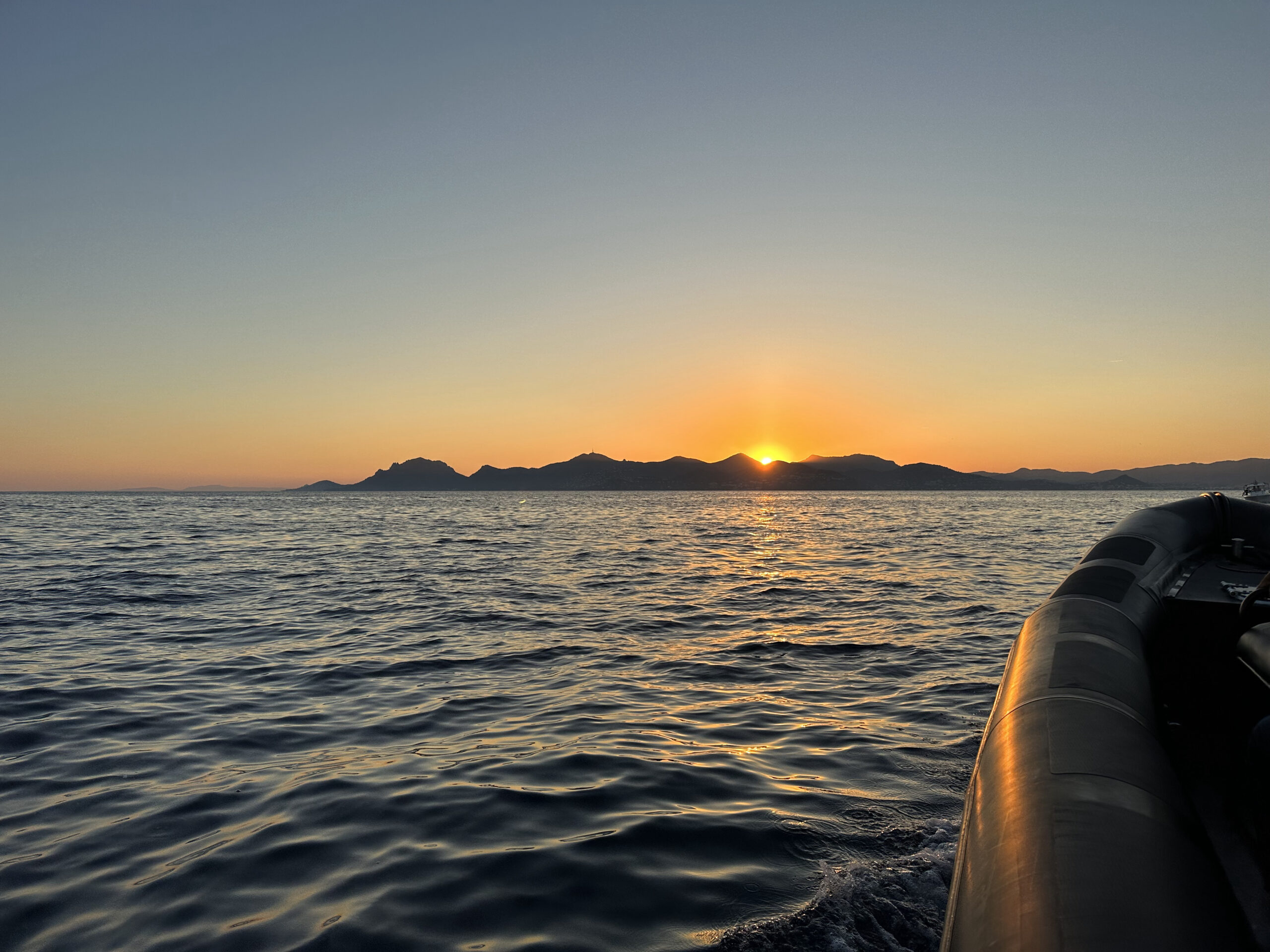 À bord de nos semi-rigides, cap sur les îles de Lérins au coucher du soleil. Entre Sainte-Marguerite et Saint-Honorat, la lumière dorée enveloppe les eaux turquoise de la baie de Cannes. Une heure de navigation pour rejoindre les meilleures loges, loin de la foule compressée sur la Croisette.